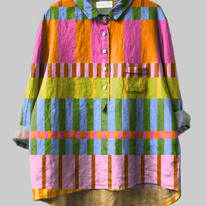 Cette blouse à boutons apporte une touche géométrique frappante avec son patchwork ludique de rayures et de blocs—tout en vous gardant au frais dans un doux mélange de lin et de coton. Le col structuré et le détail de poche ajoutent juste ce qu'il faut d'élégance à sa personnalité vive.