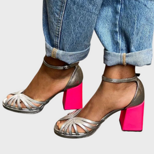 Lumineuse. Ludique. Libre. Les sandales Édith mélangent les codes avec brio : un dessus argenté élégant, une bride fine à la cheville et un talon bloc fuchsia éclatant qui ne passe pas inaperçu. Un équilibre parfait entre rétro glamour et énergie contemporaine.